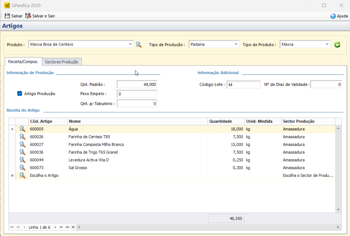Tipo de Produção → Tipo de produção onde o artigo que está a ser configurado vai ser produzido. (Ex: “Padaria”, “Pastelaria”, etc)