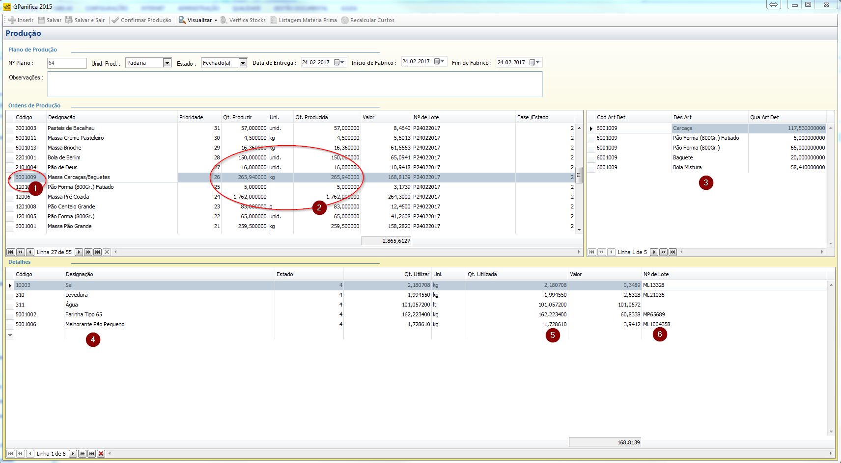 - No quadro de baixo, é possível consultar a receita de cada artigo, com as respetivas quantidades, calculadas em função da proporção e relação ao artigo principal.