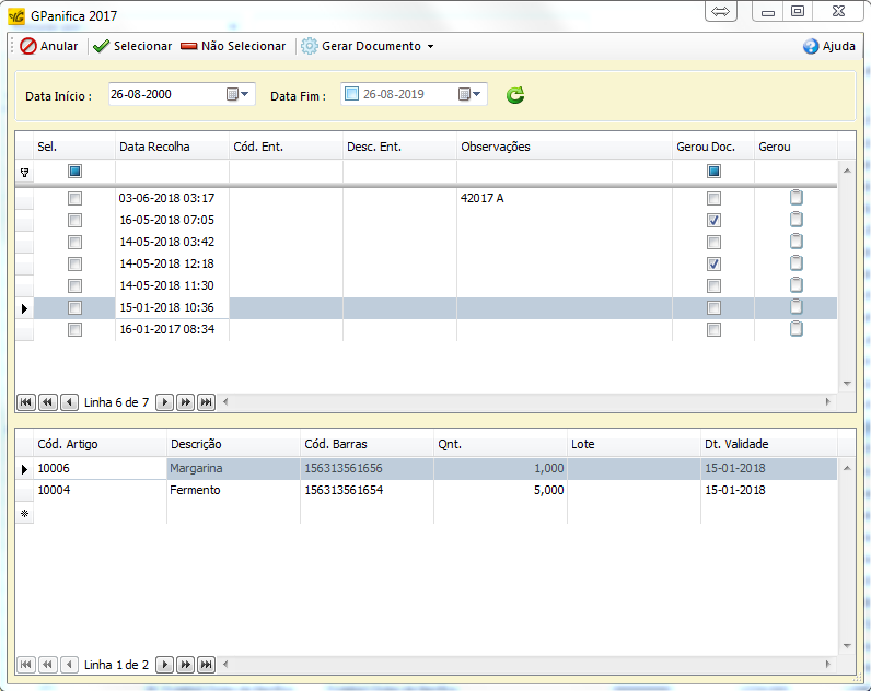 Esta funcionalidade utiliza a mesma janela que é aberta ao clicar em Stocks → Documentos de Recolha.