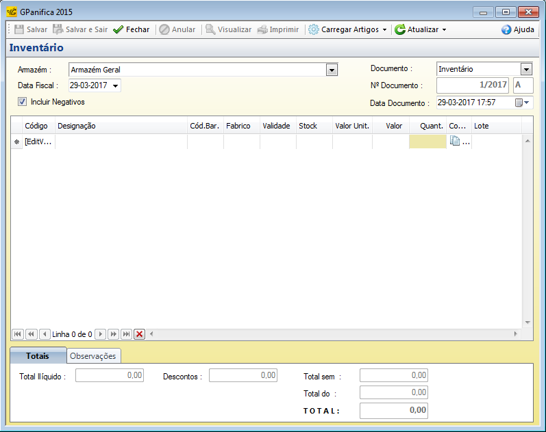 - O documento Inventário, como o nome indica, serve para efetuar inventários. No campo Quant. devem ser colocadas as quantidades que devem ficar em armazém após o fecho do documento.