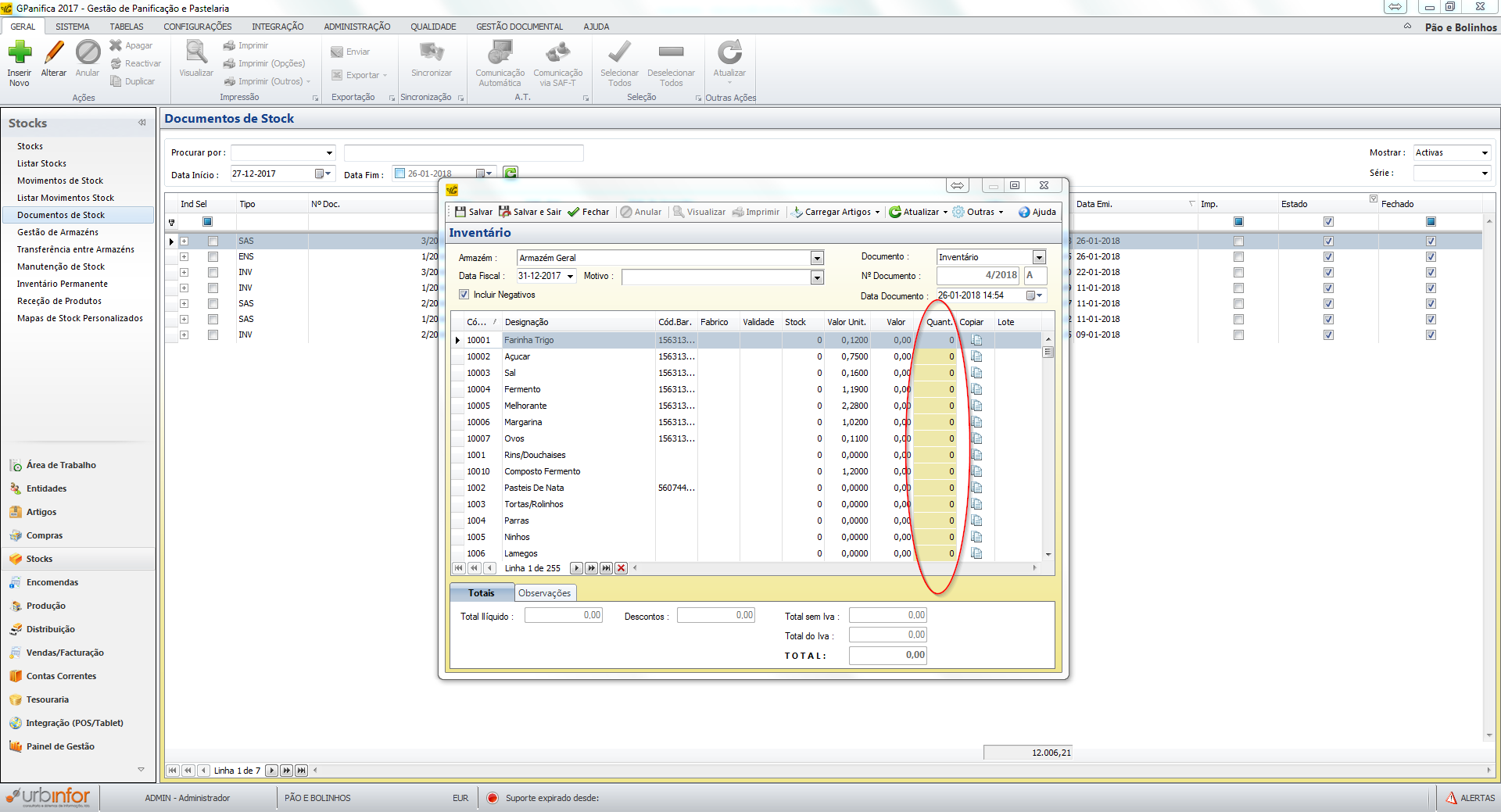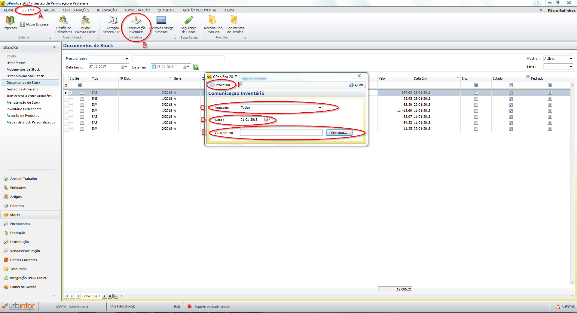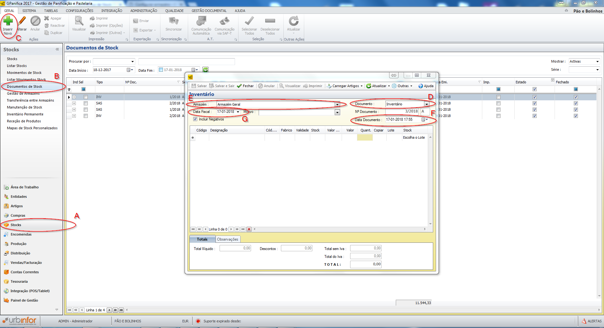 F - A Data Documento deverá ser a data e hora em que terminaram a contagem. Se enquanto estiverem a fazer a contagem houver vendas/faturação ou compras que impliquem alguma alteração nas contagens é necessário que façam a adição ou subtração das mesmas na contagem deste a hora que começaram a contagem até à hora em que terminaram;