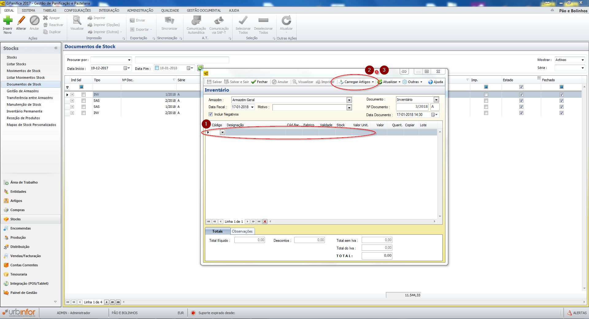 Clicar no botão Carregar Artigos -> Do Armazém. Aqui irão ser carregados todos os artigos que estão com o visto em afeta stock e que estão associados ao armazém que colocou anteriormente. Como verificar se os artigos estão associados a um determinado armazém? ? Artigos -> Fazer um duplo click no artigo que pretende consultar -> Tabela Aprovisionamento -> Código Armazém: Deverá estar preenchido com o armazém pretendido, se não estiver selecionar o mesmo.