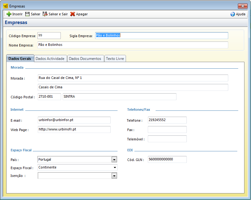 Se o módulo de EDI estiver configurado, preencha o campo Código GLN, fornecido pela entidade GS1, para permitir faturação eletrónica automatizada.