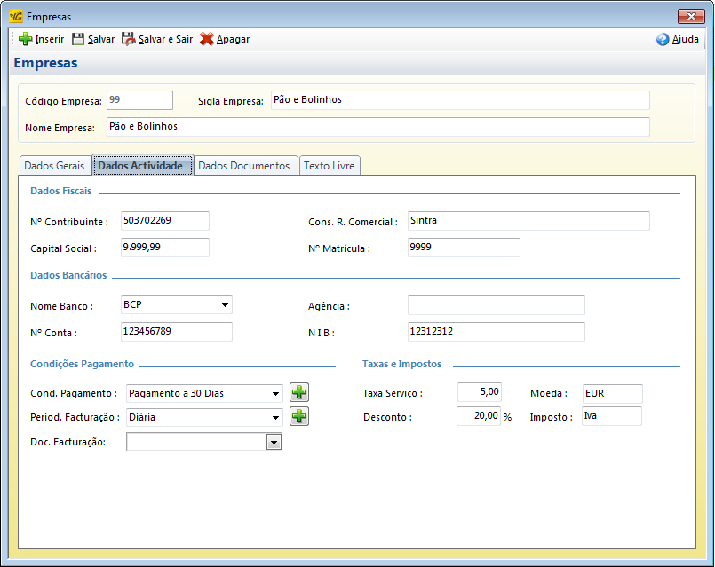 Além da informação fiscal obrigatória, existem diversos campos adicionais que agilizam a criação de outros registos no sistema, como clientes, fornecedores, artigos e outros dados relacionados.