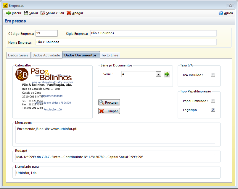 Permite a introdução de um logotipo, que será exibido em todos os documentos da empresa.