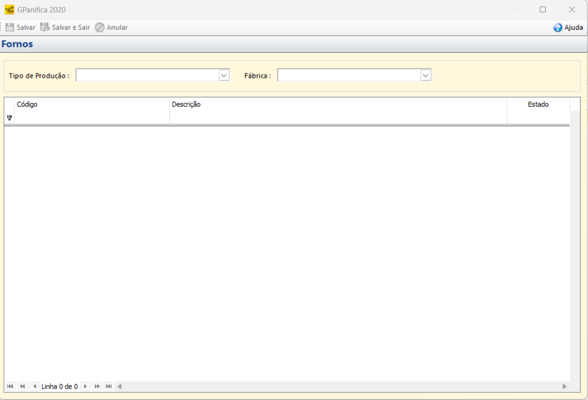 Clique no menu Produção > Fornos - irá abrir a janela “Fornos”.