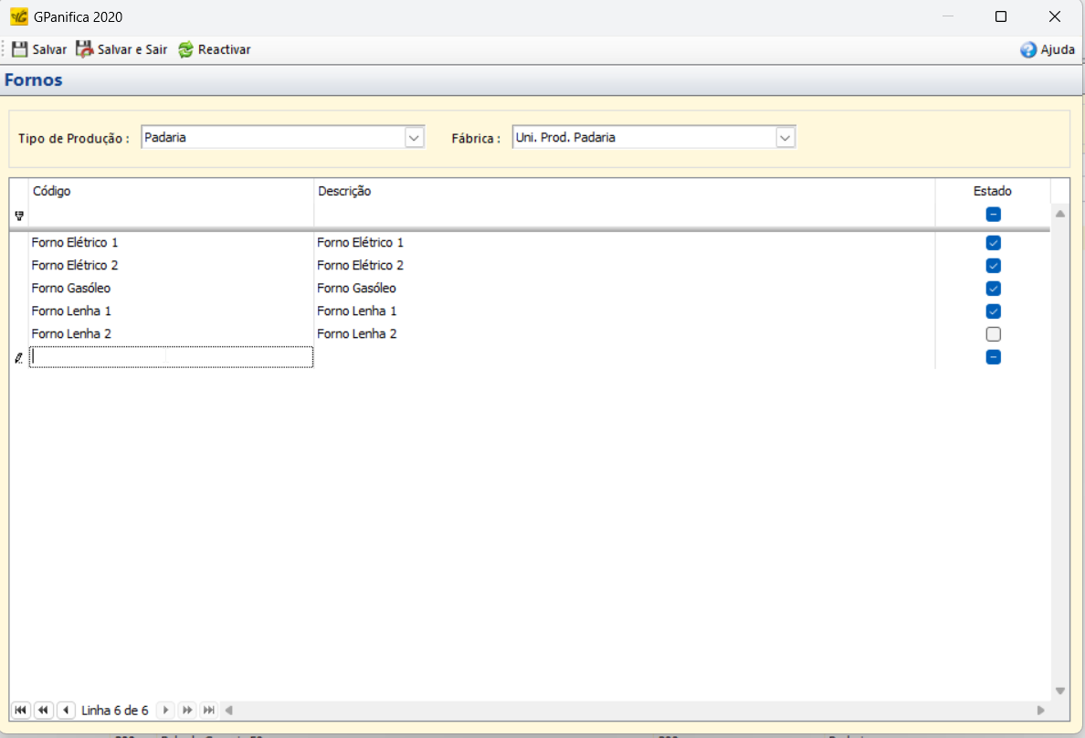 Nas Configurações de Produção é possível adicionar os fornos utilizados na produção da Padaria e da Pastelaria de uma ou mais fábricas.