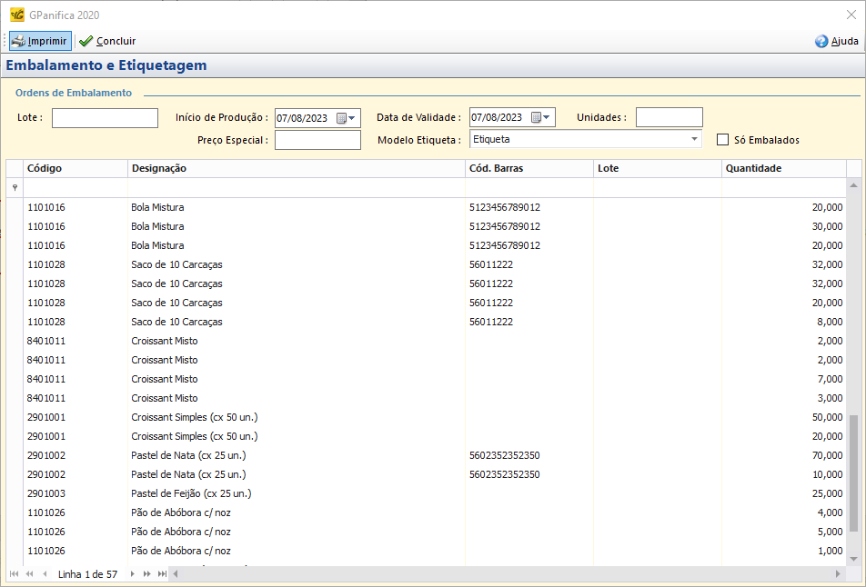 - Esta opção apresenta todos os artigos embalados de uma encomenda, para uma impressão direta das etiquetas necessárias.