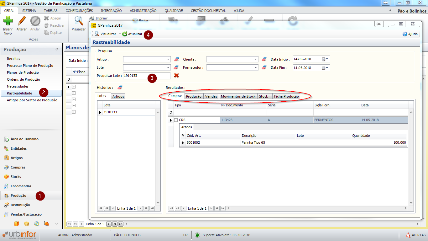 A pesquisa pode ser feita de diferentes formas, tendo em conta a informação que se pretende obter. De montante a jusante, o monitor de rastreabilidade permite consultar a rastreabilidade completa de um lote, desde a matéria-prima até à venda ao cliente.