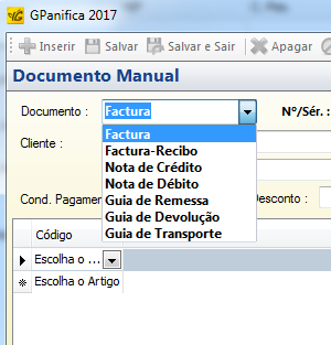 Escolha o tipo de documento (por omissão, está pré-preenchido como Fatura).