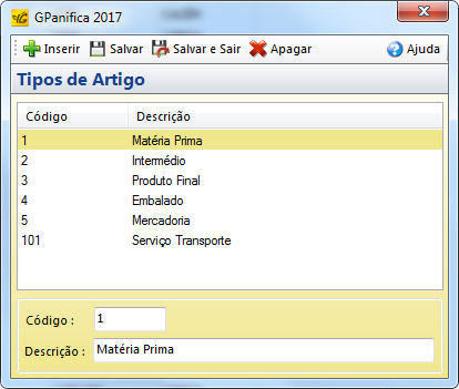 O software GPanifica já é instalado com alguns tipos de artigos, que podem ser apagados, alterados ou criados conforme a necessidade do utilizador.