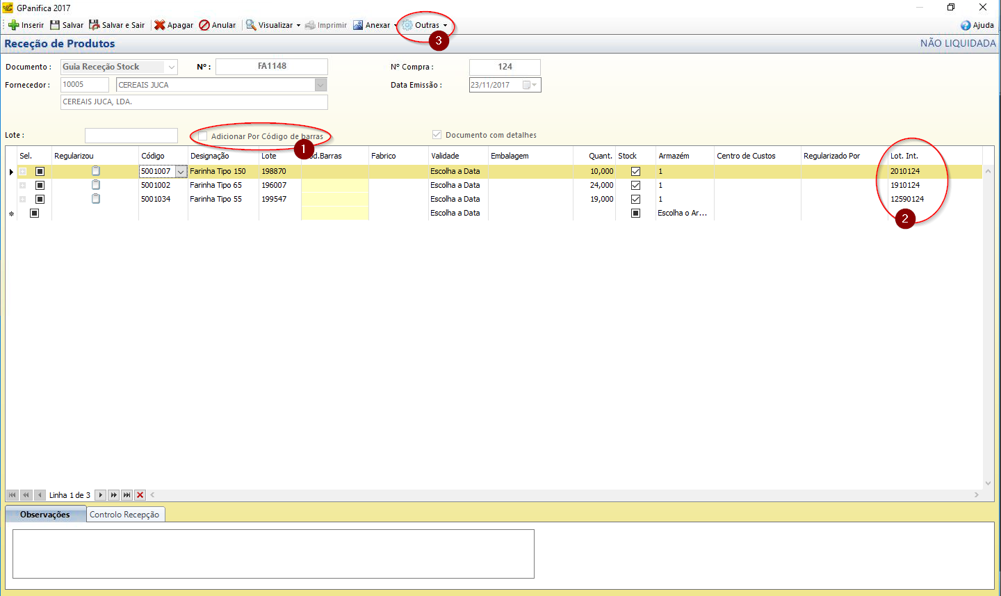 Após salvar o documento, para cada produto é gerado um lote interno, composto pelo número interno do artigo no sistema + número interno da compra, separados por "0" (2).