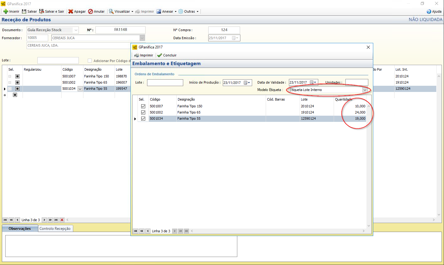 É possível configurar o sistema para gerar lotes internos na receção de matéria-prima. Estes lotes podem ser impressos em etiquetas que facilitam as transferências entre armazéns.
