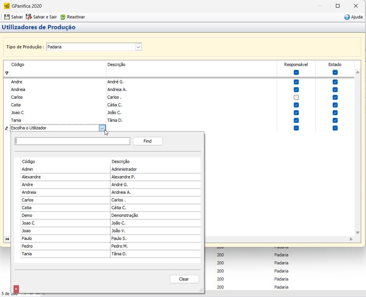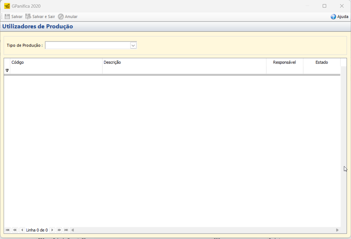 Salvar e Sair → Salva as alterações feitas e fecha a janela “Utilizadores de Produção”.